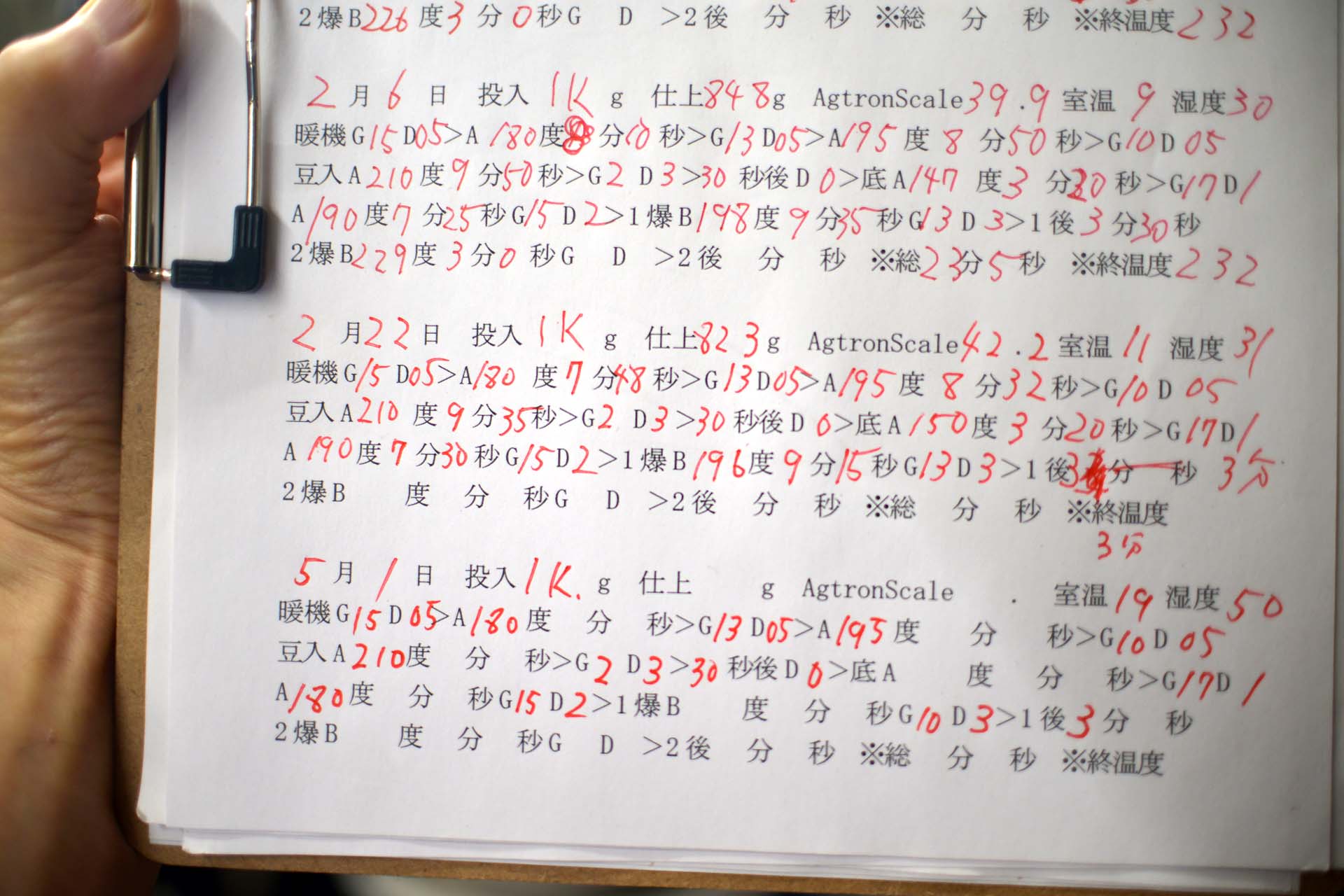 この時の暖機の数分間は作業的に少し楽なので、ドラムの中を跳ね回るまだ固い生豆時特有のシャンシャンという音に耳を傾け、青く立ち上る炎に見惚れながら暖機後のレシピアレンジに想いを馳せます