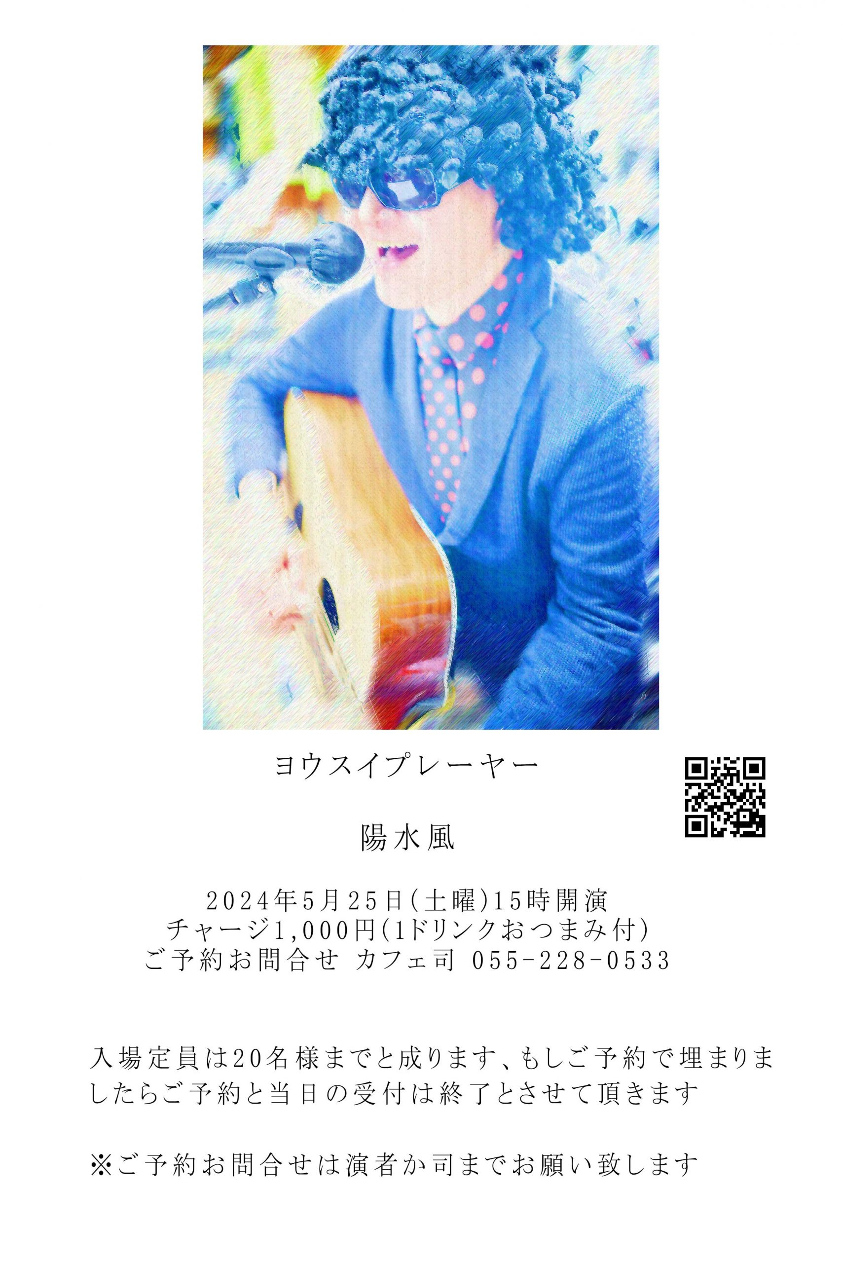 2024年5月25日(土)15時「陽水風」(ヨウスイプレーヤー)チャージ1,000円(1ドリンクおつまみ付)