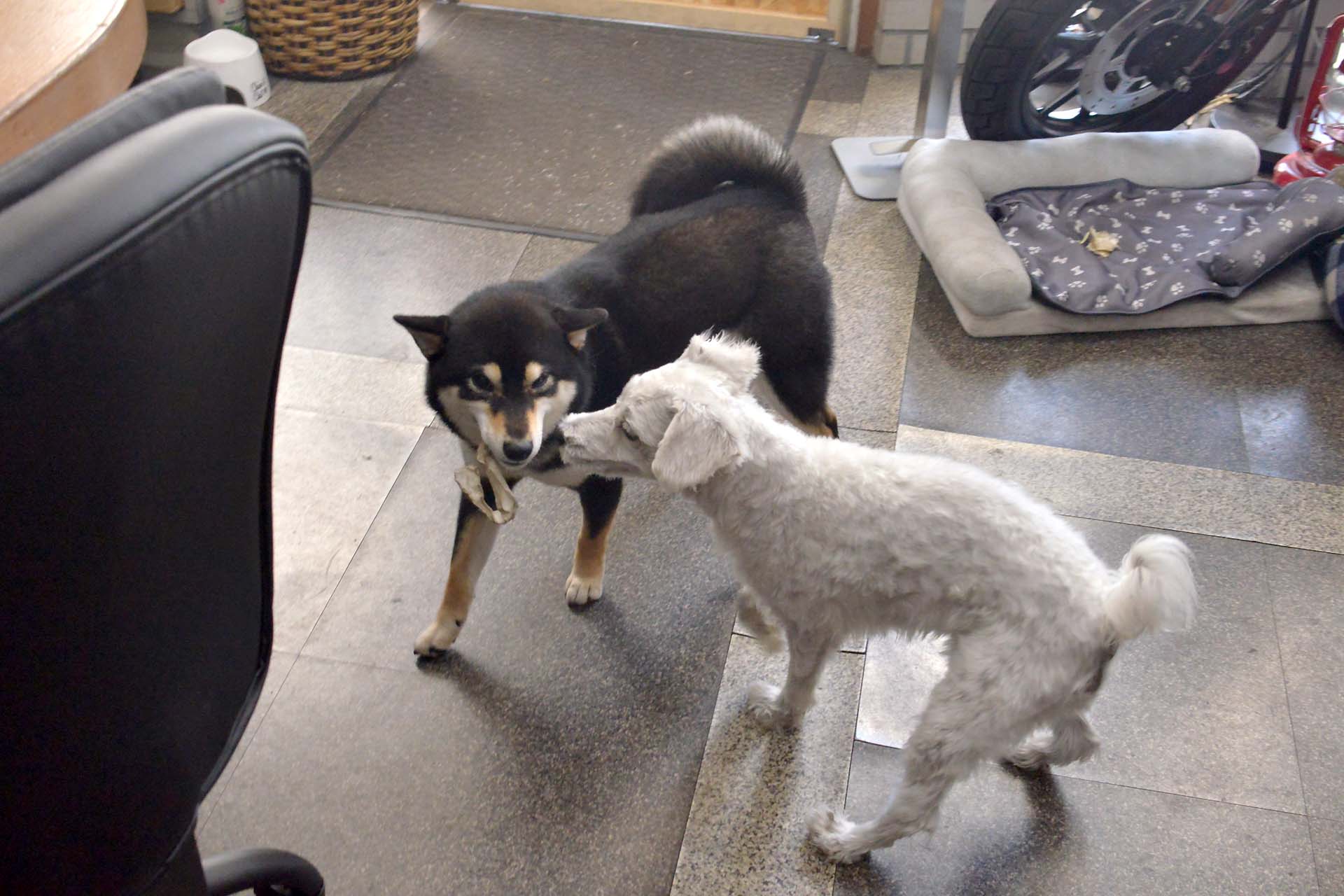 ポコちゃんは自分が見つけたオモチャを咥える口元に、マシュ君が近付き咥えているオモチャの近くにマシュ君の口が近付いても、唸ったりして威嚇したりしません