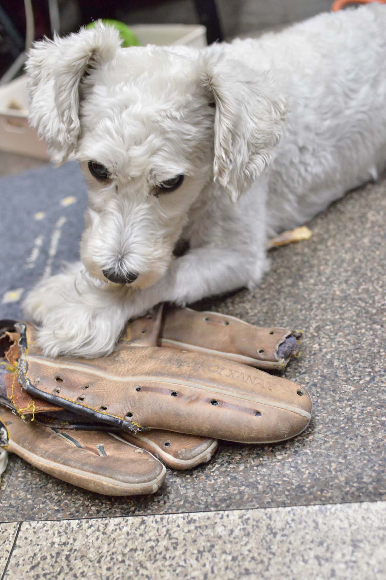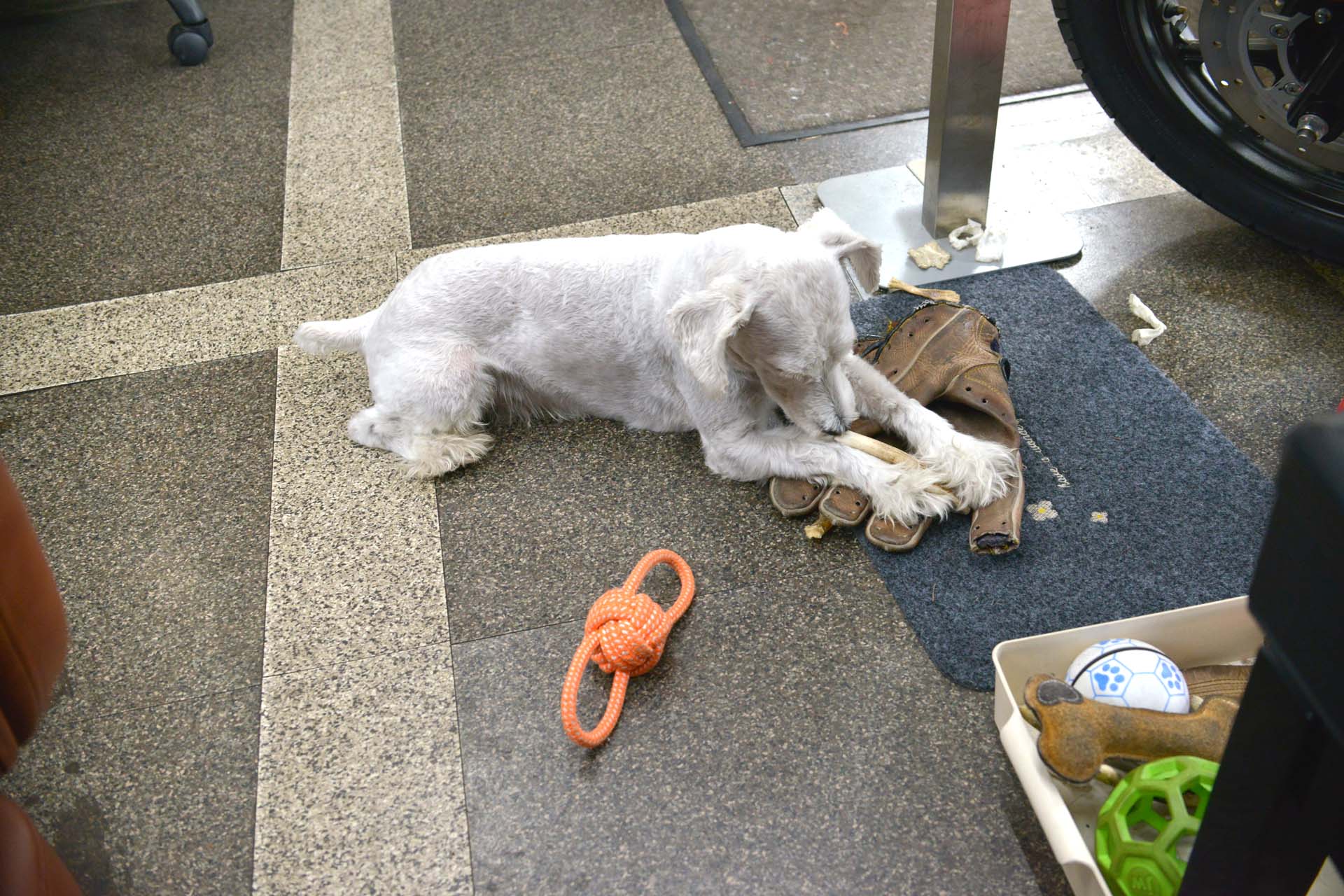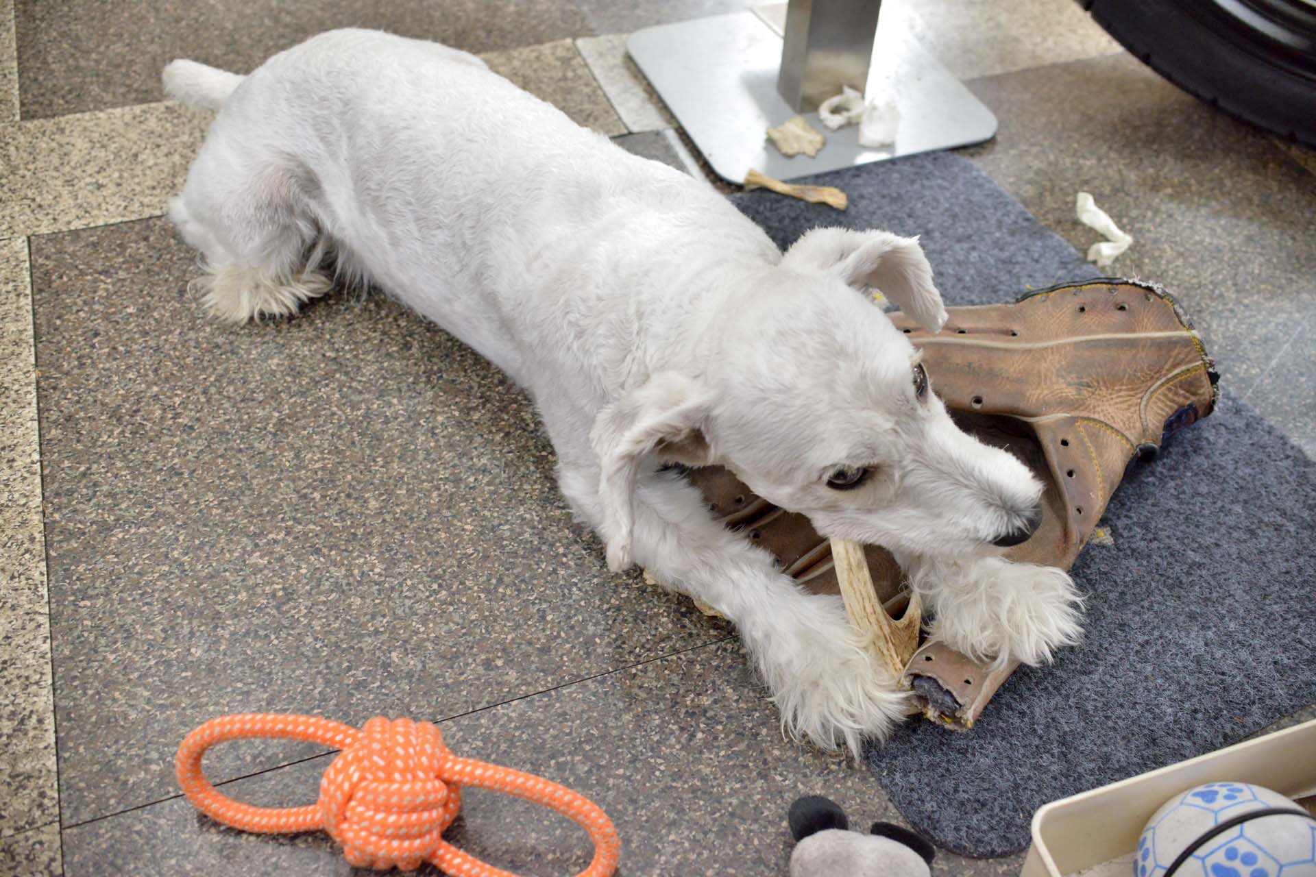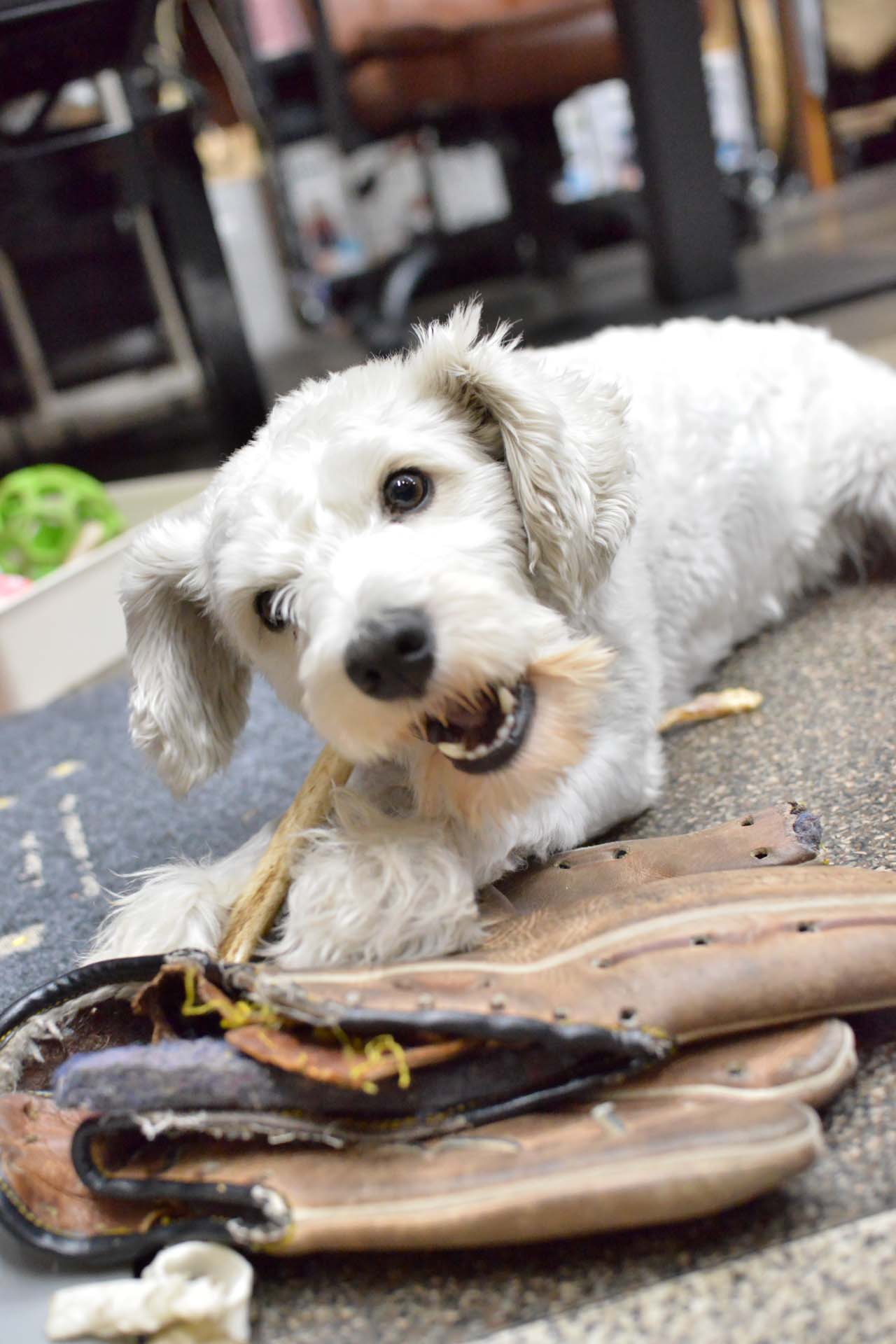 マシュ君は何時もオモチャとして振り回し噛り付いているグローブを、鹿の角を噛り付く時の下敷きのマット代わりに用いる事を自分で考え付いたようです!