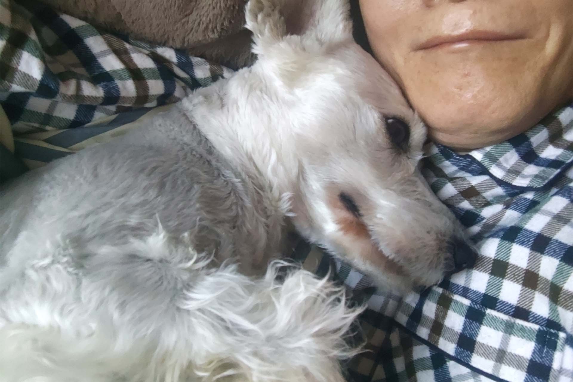 大好きなマシュ君(ミニチュアシュナウザー・ホワイト・オス・2才)と同じお布団でヌクヌク暖かく添い寝して